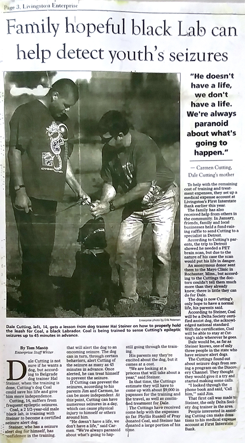 Coal will be a Delta Society certified assist dog, the acknowledged national standard. With this certification, Coal will be able to stay at Dale's side wherever he goes.